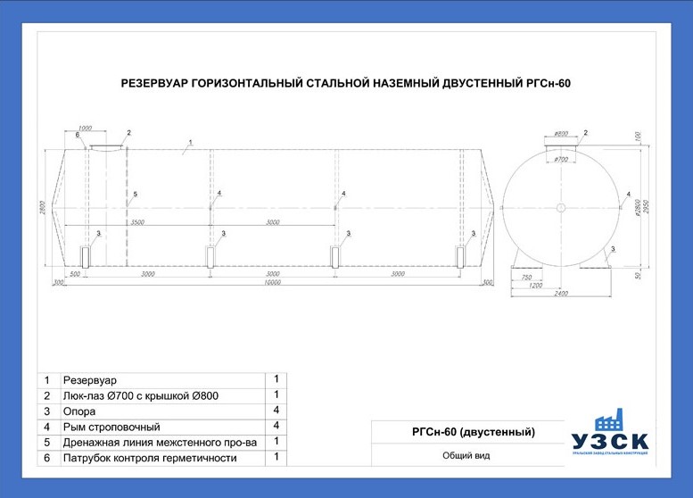 РГСДн-60: горизонтальный резервуар двустенный наземного расположения;